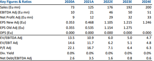 Abbiamo lasciato invariate le nostre stime sul conto economico per i prossimi tre anni, ma abbiamo abbassato quelle sull’utile per azione a causa della diluzione correlata all’ aumento di capitale mediante ABB riservato agli investitori esteri e completato ad ottobre, che ha comportato l’emissione di 595.432 nuove azioni e la raccolta di circa 4 milioni.
