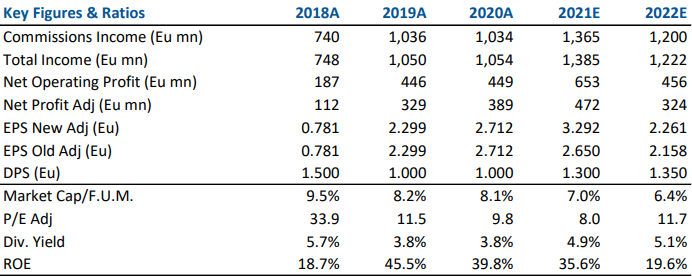 Azimut ha fornito un’indicazione di utile 2021 a 600/605 mln ben superiore alle nostre attese e a quelle di consensus di 500 mln. L’andamento degli utili 2021 beneficia del buon andamento delle performance dei prodotti gestiti da Azimut che hanno avuto una performance netta media del 6.5% lo scorso anno. Azimut ha inoltre indicato flussi netti nel mese di dicembre per 1.4 mld con gestito in crescita per 786 mln. Azimut continuerà a puntare sulla crescita nei prodotti alternativi (masse raddoppiate nel 2021 a 4.6 mld) e su piattaforme fintech innovative. Indicato un contributo Ebitda dal segmento internazionale di 70 mln nel 2021. Infine, Azimut ha indicato di avere presentato una proposta di cambiamento delle commissioni alle autorità lussemburghesi sui fondi UCITS (AuM per ~24 mld) che prevedono un aumento delle commissioni ricorrenti rispetto alle commissioni variabili in linea con le guidelines ESMA con meccanismi di restituzione di una parte delle commissioni in caso di performance inferiori al benchmark, maggiori dettagli su queste modifiche verranno comunicate nei prossimi mesi.
