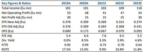 La revisione per gli anni successivi (2022/2023) è più sostanziale, a causa della pressione sul margine di intermediazione, solo parzialmente compensata da un costo del rischio più basso.