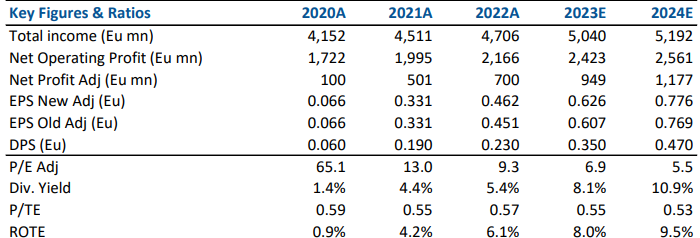 L'EPS 2022 è stato superiore alla recente guidance (0.46 euro vs 0.45 euro) ed è stato confermato il target di EPS 2023 >0.60 euro nonostante sia stata rivista al rialzo la guidance sul margine d’interesse 2023 (da >2.5 mld a >2.7 mld).
