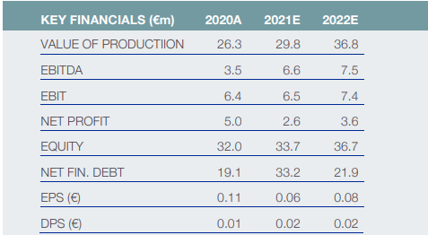 Gli analisti stimano, per il 2021, un valore della produzione pari a 29,8 milioni di euro, un Ebitda di 6,6 milioni di euro, e profitti netti pari a 2,6 milioni di euro.