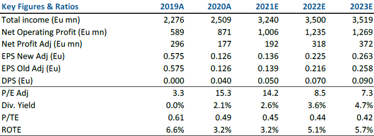 Sottolineiamo che l’incentivo derivante dalla trasformazione in crediti fiscali delle DTA, attualmente in vigore solo per il 2021, potrebbe far accelerare il deal nella seconda parte dell’anno.