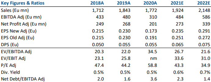 Vendite nette in rialzo del 10,5% a 397,9 milioni di euro (+17,9% su base organica; se confrontata con il primo trimestre 2019, che rappresenta la base di riferimento invariata rispetto all'impatto Covid-19, la crescita organica e' stata del 12,1%).