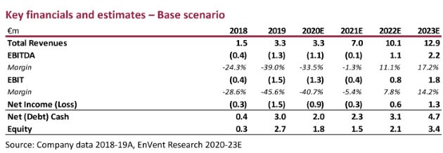 EnVent ha previsto due scenari, sia in quello basso che in quello di base è prevista una ripresa fra il 2021-23. Lo scenario base prevede, per il 2020, ricavi pari a 3,3 milioni di euro, destinati a diventare 12,9 milioni alla fine del 2023.