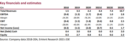 Per il 2021, gli analisti stimano ricavi pari a 4,4 milioni di euro, il doppio rispetto alla cifra di 2,2 milioni del 2020. Per il 2023, sono attesi ricavi pari a 10,7 milioni.