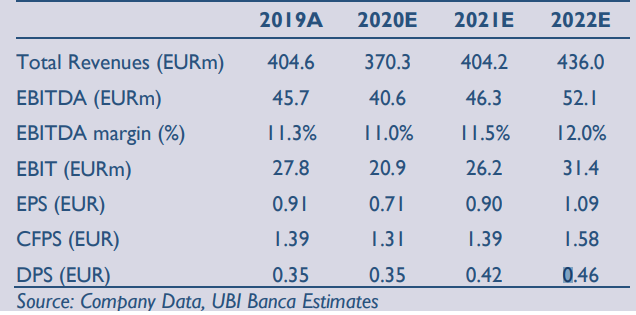 Per il 2020, sono stimati ricavi pari a 370,3 milioni di euro, con Ebitda a 40,6 milioni e un utile per azione pari a 0,71 euro. Nel 2021, i ricavi sono visti a 404,2 milioni di euro, l’Ebitda a 46,3 milioni di euro, e l’utile per azione a 0,90 euro.