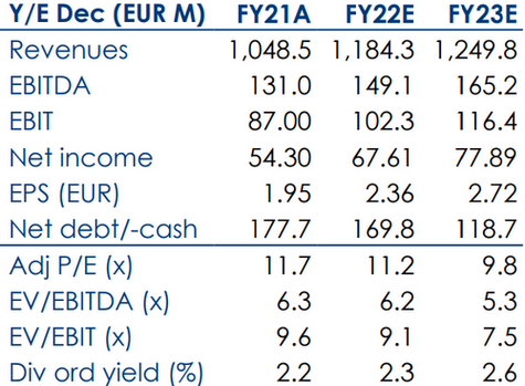 Le stime sono quindi state riviste al rialzo. Per il 2022, i ricavi sono visti pari a 1,18 milioni di euro, l'Ebitda a 149 milioni di euro, gli utili netti a 67,6 milioni.