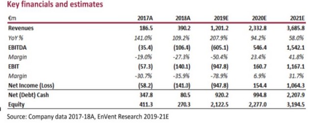 La tabella sottostante mostra invece le stime di EnVent che evidenziano una crescita di tutti le voci di bilancio. Il fatturato, alla fine del 2019, dovrebbe crescere del 208% su base annua, arrivando a 1,2 milioni di euro. Il pareggio è atteso già nel 2020.