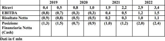 Dal 2021 sono previsti risultati positivi anche in termini di Ebitda e di risultato netto, mentre nel 2022 la posizione finanziaria netta si prevede cash positive e compresa tra 2,0 e 2,4 milioni.