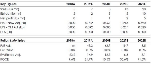 Abbiamo rivisto al ribasso le stime sulle vendite nette per includere la nuova politica commerciale di Cyberoo. Abbiamo invece alzato quella sui nuovi clienti per il 2020.