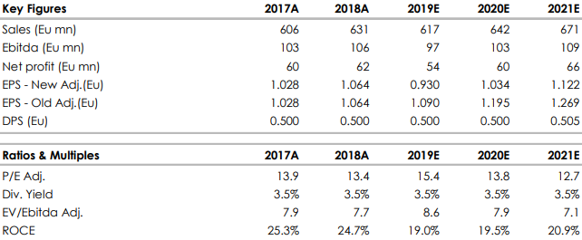 La società ha rivisto le indicazioni sul 2019 che vedono ora un secondo semestre in linea con il primo, e quindi i ricavi organici si prevedono a -3,8% anno su anno, con margini stabili. Ciò implica un EBITDA in calo del 4/5% sull'anno, sotto le nostre attuali stime di EBITDA stabile.