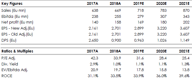 In particolare, Diasorin ha chiuso il terzo trimestre con risultati migliori delle attese sulle principali metriche di riferimento (+1% i ricavi, +7%-8% l’Ebitda rispetto alle nostre stime e al consensus). Sono stati confermati gli obiettivi di crescita organica del fatturato 2019 sulla parte bassa del range (+5-8% su base annua), questo implica una forte accelerazione nel quarto trimestre (+7% su base annua, prendendo a riferimento +5% sull’anno). Confermati anche gli obiettivi sul margine (Ebitda margin comparabile con il livello del 2018, 38,5% a cambi costanti), nonostante la significativa performance dei nove mesi (39,8%). La notizia della partnership con Qiagen dimostra la grande affidabilità del gruppo e apre ad altri spazi di crescita.