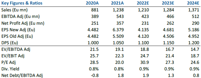 Includendo gli obiettivi del piano nel nostro modello, abbiamo ridotto il nostro EPS 2022-24 del 15-20%, principalmente a causa di indicazioni più caute sul 2022, mentre la nostra nuova previsione sul 2025 (1,48 miliardi di euro di vendite, 37,8% di margine) è leggermente inferiore al target di Gruppo (circa 1,5 miliardi di euro di fatturato, 38%).