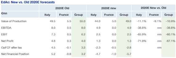 ValueTrack ha abbassato le stime a causa dell’epidemia Covid-19, i cui effetti negativi si riverberano su tutta l’economia, quindi anche sul settore dell’edilizia. La stima sul valore della produzione è stata tagliata dell’11%, l’Ebita, l’Ebit e i profitti netti rispettivamente del -39%, -60% e -67%.