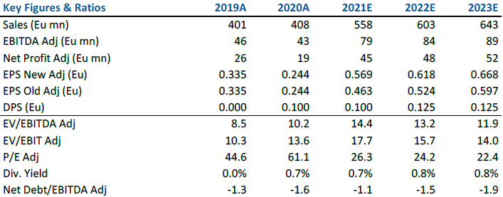 Le indicazioni sulla guidance sono state confermate e ci sembrano conservative. EL.EN ha confermato i suoi obiettivi FY21 per vendite >550 mln e per un EBIT del secondo semestre in rialzo sequenziale (ovvero >62 mln per FY21), implicando una crescita delle vendite del +3,5% e un margine EBIT del 12% nel quarto trimestre, nella parte inferiore della guidance.