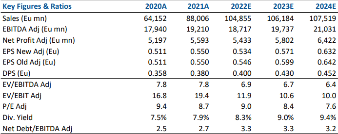 Guidance 2022 confermata con EBITDA a 19.0-19.6 mld, utile netto a 5.6-5.8 mld, dividendo 0.40 euro per azione, debito netto indicato a 61.0 mld.