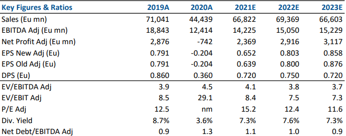 I dati trimestrali sono lievemente inferiori alle stime, ma il ritardo è facilmente recuperabile nel futuro grazie allo scenario di fondo in costante miglioramento. Giudichiamo molto positivamente l'accelerazione sul progetto di valorizzazione degli asset retail/rinnovabili. C'è spazio per confermare la visione positiva. Sul lato dei dividendi, prevediamo per il 2021 un dividendo per azione di 0,72 euro per azione, ipotizzando lo scenario dipinto da ENI di un Brent a 53 usd/bl.