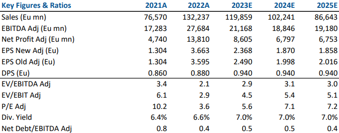 Abbiamo aggiornato le nostre proiezioni (E&P ridotto, GGP aumentato), che si basano su ipotesi per i prezzi del petrolio e del gas che sono sostanzialmente in linea con le attuali curve forward (Brent 2023-24-25 rispettivamente a 85-75-70 usd/bl).
