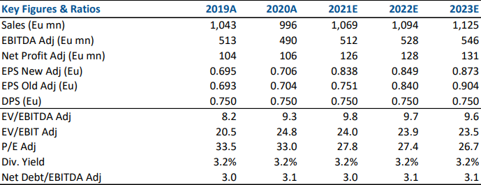 Alla luce delle novità alziamo le stime di utile netto 2021-22 del 12% e dell'1% rispettivamente. Aggiustiamo il target price 28,0 euro.