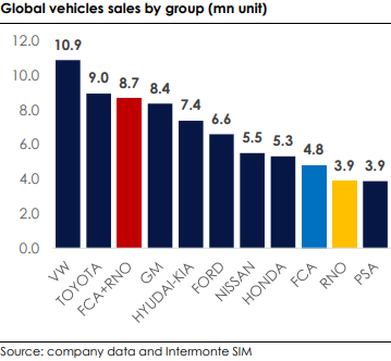 • Il business combinato sarà di proprietà 50-50 azionisti FCA e Renault, con un consiglio composto principalmente da amministratori indipendenti. La combinazione creerebbe il terzo maggior produttore automotive al mondo, con vendite annuali pari a 8,7 milioni veicoli; non ci saranno chiusure di impianti. I portafogli di marchi ampi e complementari offrono una copertura completa del mercato, dal lusso al mercato di massa.