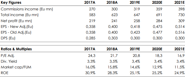 I risultati del secondo trimestre sono stati sostanzialmente in linea con le attese. Luglio è stato un mese positivo e il lancio di nuovi prodotti/servizi rende il management fiducioso sul miglioramento nel secondo semestre. Le commissioni nette dovrebbero crescere in linea con le nostre aspettative del 13/14% nel 2019/2020 grazie all'espansione delle attività. Gli afflussi netti da inizio anno (3,7 miliardi) registrano un mix peggiore del previsto, principalmente a causa di fattori temporanei che hanno favorito la crescita dei depositi (721 milioni). Fineco è fiduciosa di convertire alcuni di questi depositi in attività gestite nei prossimi mesi.