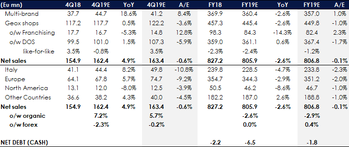 Geox [GEO.MI] ha presentato i risultati preliminari sul 2019 vedono ricavi pari a 805,9 milioni in calo del 2,6% a cambi correnti e del 3,3% a cambi costanti.