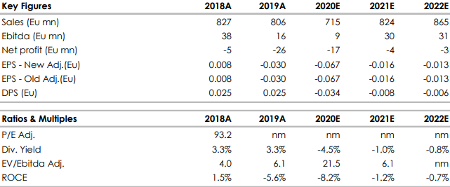 I risultati 2019 sono stati allineati alle attese, ma le brutte indicazioni sulla prima parte del 2020 hanno peggiorato un quadro già fragile. La nomina del nuovo a.d. (il terzo avvicendamento in 3 anni), il nuovo piano di razionalizzazione dei punti vendita diretti e i conseguenti costi di ristrutturazione sul 2019 sono giunti inaspettati. Prevediamo che influiranno negativamente sull’andamento del titolo. L'unico trigger potrebbe arrivare dall’ipotesi di delisting da parte dell’azionista di controllo, che già era stata avanzata in passato. Le basse quotazioni e le ingenti disponibilità finanziarie personali dell'azionista di maggioranza potrebbero stimolare un'opa.