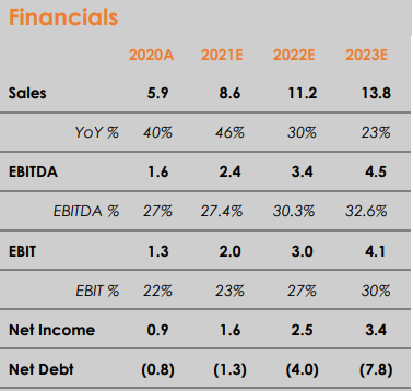 Alla fine del 2023, il fatturato è visto arrivare a 13,8 milioni di euro, con un Ebitda pari a 4,5 milioni di euro, margini al 33%.