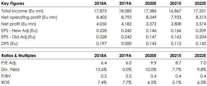 Aggiustiamo le nostre stime di utile per azione (-0,5% per il 2020 e +1,8% per il 2021) per tener conto di un maggiore contributo dal margine di interesse e dal trading che vengono compensati da un costo del rischio più elevato. Abbiamo inoltre incorporato le nuove linee guida per i dividendi (payout ratio pari al 75%/70% per il 2020/2021). Manteniamo stime prudenti, sotto a quelle dell'azienda, per il 2021.