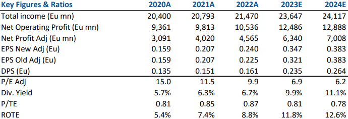 Alla luce della migliorata asset quality (gross NPE ratio al 2.3%), dell’elevata sensitivity ai tassi (guidance margine d’interesse 2023 da +2 mld YoY a +2.5 mld YoY) e dell’outlook sul costo del rischio (30/40bps), alziamo le stime di utile per azione del periodo 2023/2024 del +8% e +0.2% rispettivamente.
