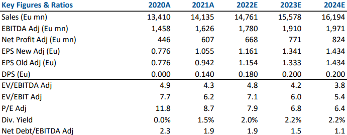 Risultati 2021 leggermente migliori delle nostre stime (i dati preliminari erano già diffusi). Guidance di FCF per il 2022 di circa 500 mln ben al di sopra del consenso di 340 mln, il che implica che le azioni scambiano con un rendimento FCF del 10,6% sul 2022. La generazione di cassa migliorerà ulteriormente a >700 milioni di euro nel 2023-25. Set di dati positivi. Rafforziamo la view positiva.