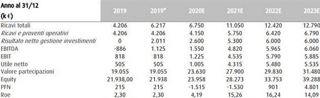 Banca Finnat stima, per il 2020, ricavi totali pari a 6,750 milioni di euro, un Ebitda pari a 1,55 milioni di euro, Ebit a 1,225 milioni di euro, e utile netto pari a 1 milione circa