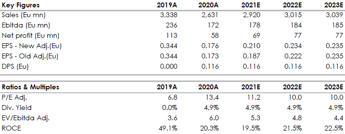 In base ai risultati trimestrali, abbiamo rivisto al rialzo le nostre proiezioni per i ricavi e per l'EBITDA 2021 assumendo un margine del 6,1%. Dal lato del debito, abbiamo leggermente migliorato le nostre proiezioni. Ritocchiamo verso l'alto il target price da precedente 2,0 euro.