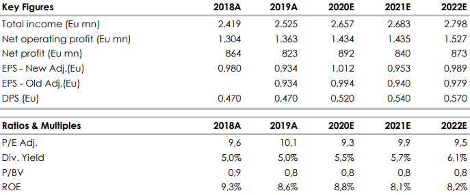 Abbiamo mantenuto invariate le stime 2020/2021 in quanto il maggior contributo da Generali viene compensato da un’attesa crescita del costo del rischio. I costi operativi sono attesi leggermente più alti. I dati pubblicati sono stati solidi dal punto di vista dei ricavi, del controllo costi e del contenuto costo del rischio. Bene il capitale e il dividendo. Crediamo che il titolo possa essere uno dei più resilienti all'interno del settore finanziario nella fase critica della pandemia. Il nostro target price è basato esclusivamente su considerazioni di analisi fondamentale. Il mercato, secondo noi, non sconta nell'attuale quotazione il potenziale speculativo.