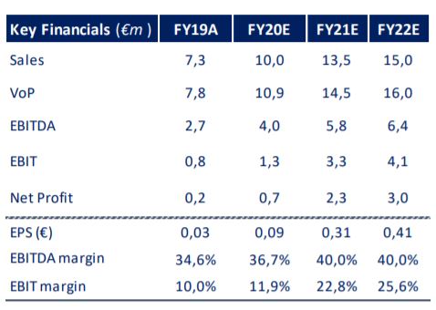 Gli analisti stimano, per il periodo 2019-22, una crescita costante del volume d’affari. I ricavi sono visti passare dai 7,3 milioni del 2019, a 15 milioni del 2020. I profitti netti dovrebbero crescere da 0,2 milioni a 3 milioni euro.