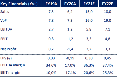 Per gli anni successivi, il valore della produzione è visto aumentare fino a 22,1 milioni (CAGR 20A-23: 44,86%) nel 2023, con EBITDA pari a 8,85 milioni (EBITDA margin del 40%), in crescita rispetto alla cifra di 1,24 milioni del 2020 (EBITDA margin del 17%)