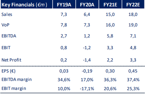 Per gli anni successivi, il valore della produzione è visto aumentare fino a 22,1 milioni (CAGR 20A-23: 44,86%) nel 2023, con EBITDA pari a 8,85 milioni (EBITDA margin del 40%), in crescita rispetto alla cifra di 1,24 milioni del 2020 (EBITDA margin del 17%).