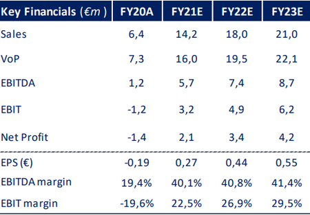 Per gli anni successivi, il valore della produzione dovrebbe aumentare fino a 22,10 milioni di euro (tasso annuo di crescita composto 2020-23: 44,86%) nel 2023, con EBITDA pari a 8,70 milioni (corrispondente ad un EBITDA margin del 41,4%), in crescita rispetto al valore di 1,24 milioni del 2020 (corrispondente ad un EBITDA Adj. margin del 19,4%).