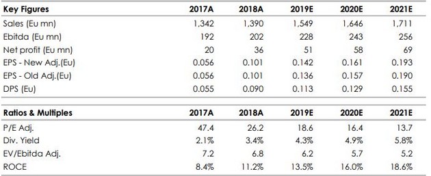 Costi per interesse più bassi hanno un impatto positivo sull’utile per azione, +4% nel 2019. Le nostre stime 2019, che includono i nuovi principi IFRS16, e scontano un incremernto in valore assoluto rispettivamente di 8 milioni di euro per l'Ebitda, 1 milione di Ebit, e un calo di 20 milioni del debito netto.