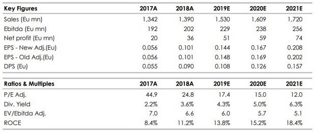 Nonostante la riduzione delle stime sul 2020, riteniamo che l’azione sia sottovalutata e che stia trattando ad uno sconto del 15% rispetto alle imprese comparabili, calcolato sulla base del rapporto fra valore d’impresa (EV) ed Ebitda rettificato al 2020.