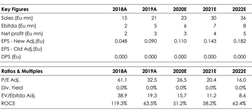 Per il periodo 2020-2023, stimiamo un tasso annuo di crescita composto dei ricavi (CAGR) pari al +18,3%, con un fatturato a fine periodo pari a 41,7 milioni di euro, spinto da: