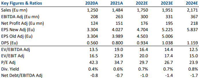 L'EBIT è stato influenzato da 5 mln di costi non ricorrenti. La liquidità netta a fine 2021 era pari a 322 mln, al di sotto delle nostre stime a causa dell'impatto di fusioni e acquisizioni.