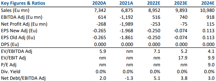 Confermiamo la visione cauta sul titolo, dopo i risultati deludenti. Abbiamo incorporato nelle stime 2021 i risultati preliminari forniti fino al livello di EBIT e il debito netto. Temiamo altre possibili implicazioni negative in merito all’esecuzione dei differenti progetti, lasciamo inalterate le stime 2022 e anni seguenti. Al nostro target price il titolo viene valutato circa 5.0x il rapporto EV/EBITDA 2023.