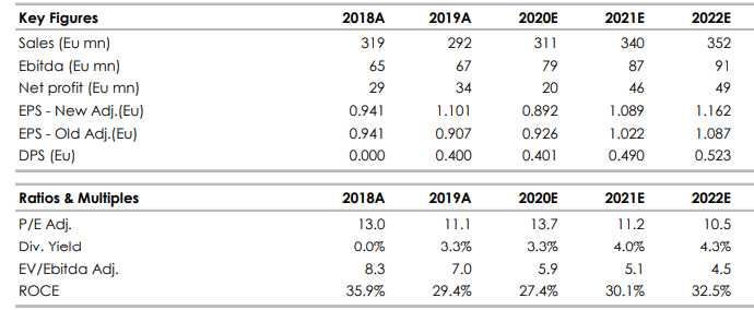 Complessivamente, al netto degli effetti IFRS, le nostre stime riflettono aspettative più ottimistiche a livello di ricavi ed Ebitda (entrambi +1,5% e +1% per il 2020 e il 2021), mentre abbiamo ridotto le nostre previsioni sugli ammortamenti e gli accantonamenti e incluso maggiori oneri finanziari nel 2020.
