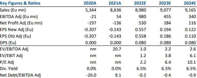 Abbiamo rivisto al rialzo il nostro scenario macro per il 2022, ipotizzando un margine di riferimento EMC di 8,6 USD/bl rispetto ai precedenti 3,8 USD/bl. Dopo i risultati del 2Q 2022, lasciamo sostanzialmente invariate le nostre proiezioni del margine operativo per il 2022. Sul bilancio, invece, stiamo migliorando la posizione di cassa netta 2022, a seguito della riduzione del capitale circolante maggiore del previsto registrata nel trimestre.
