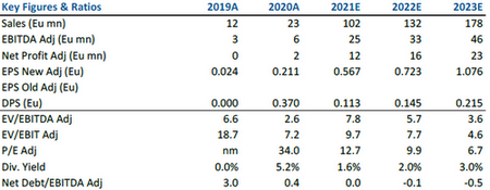 Riteniamo inoltre che una generazione di cassa media, pari a 18 milioni di euro nel periodo 2022-2024, possa sostenere i piani di espansione esterna dell'azienda, che punta, attraverso le acquisizioni, a completare la propria gamma di prodotti ed entrare nei mercati esteri.
