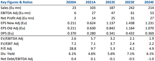 Rivediamo le nostre stime in rialzo. Il valore della produzione 2022 dovrebbe raggiungere 187 milioni di euro, +81,9% su base annua, +22,2% rispetto alle precedenti stime (153,2 milioni). Il risultato è impressionante, se si considera che 3 anni fa la società aveva totalizzato 11,9 milioni.