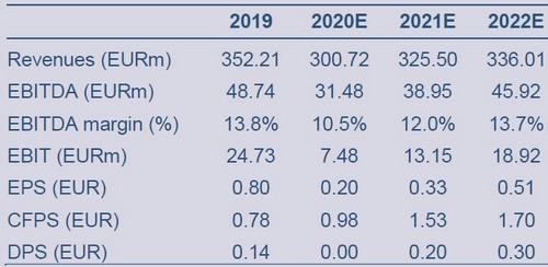 Le stime di Ubi, che si basano sullo scenario base, vede, per il 2020 ricavi pari a 300,72 milioni di euro, un Ebitda pari a 31,48 milioni, e un Eps pari a 0,20 euro.