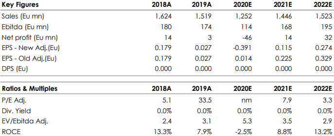 Il prossimo trimestre previsto debole avrà ripercussioni sui margini e sulla liquidità, mentre la visibilità sulla possibile ripresa rimane molto bassa. La nostra nuova valutazione riflette i tagli alle stime e valuta il titolo circa 4,1 volte il rapporto EV/EBITDA nel biennio 2020-2021, multiplo inferiore del 25% rispetto alla media dei precedenti tre anni. Non prevediamo il ritorno al dividendo in tempi brevi.