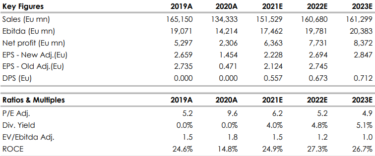 Guardando al possibile dividendo ordinario 2021 (da pagare nel 2022) si potrebbe distribuire almeno 0,64 euro per azione (ovvero 2 miliardi di euro). Ricordiamo che lo scorso 13 gennaio la società ha assegnato la distribuizione del dividendo straordinario da 1,84 per azione (2,9 miliardi in totale) andata in pagamento (staccato) il 29 gennaio 2021 nell’ambito della fusione con PSA. Rafforziamo la raccomandazione positiva per il potenziale valore esprimibile tramite la realizzazione delle sinergie tra FCA e Peugeot.